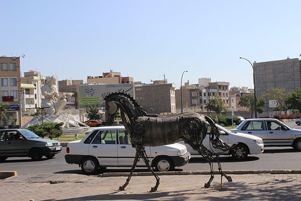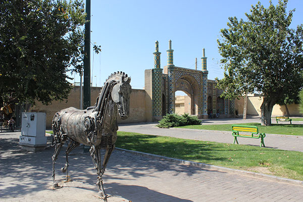 راهی دروازه میشوم یک مجسمه آهنی اسب و یک ساعت آفتابی نخستین چیزهایی است که توجهت را جلب میکند. جانمایی هیچ کدام هماهنگی با یک محیط تاریخی ندارد و منظر آن را به هم ریخته است.