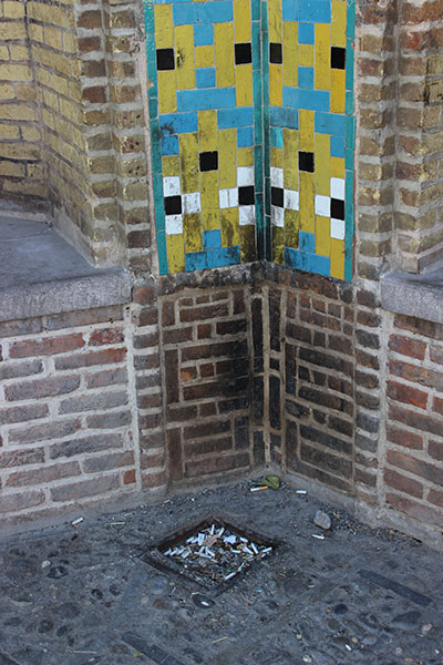 از همه اینها در کنار سیم و تیرکهای برق که بگذری اینجا پاتوق معتادین است. کاشیهای سیاه و رد سیگارها نفس درب کوشک را بردیده است.